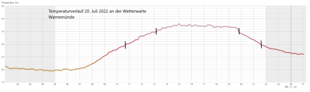 Das Diagramm links zeigt den Temperaturverlauf am 20. Juli. Von etwa 13 bis fast 20 Uhr lag die Lufttemperatur über 35°C! Mäßiger ablandiger S/SO-Wind ließ keinen thermisch bedingten Seewind zu.