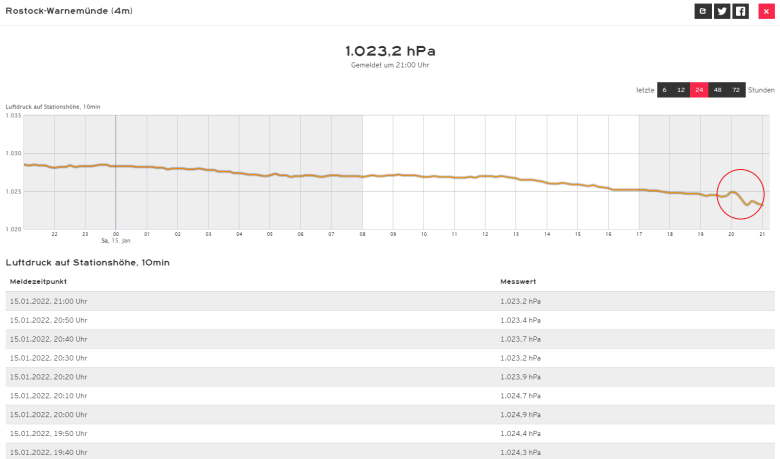 Ach ja.. last, but not least.. Ein Kuriosum, welches diesen Jahresrückblick in Textform abschließen soll und fast unbemerkt blieb, zumindest wenn die Medien es nicht aufgegriffen hätten, war die Luftdruckschwankung am 15. Januar, welche durch mehrere Druckwellen infolge eines Vulkanausbruchs im Südpazifik-Inselstaat Tonga ausgelöst wurden. Die Druckwelle hat bis nach Warnemünde fast 17.000 km (circa 15 Stunden „Reisezeit“) zurückgelegt und war dennoch eindeutig anhand der vom Barometer aufgezeichneten Daten erkennbar. Erst kam es zu einem Druckanstieg (von 1.024,3 auf 1.024,9 hPa), dann folgte ein deutlicher Rückgang (bis auf 1.023,2 hPa) und anschließend ein Zurückpendeln auf das vorherige Niveau.