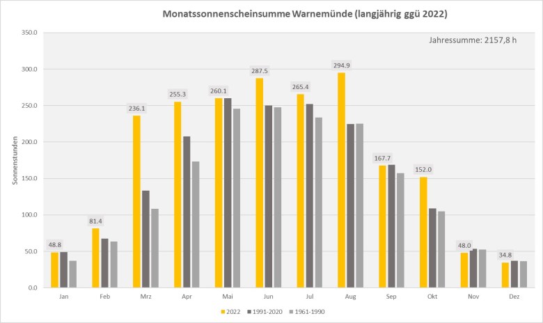 Die Sonne zeigte sich im abgelaufenen Jahr rund 2158 Stunden und damit außergewöhnlich viel. Es ist das zweitsonnigste Jahr seit 1947 und hinter 2018 (2187 h). Das 30-Jahresmittel von 1991-2020 weist etwa 1812 Sonnenstunden für Warnemünde aus, die Referenzperiode 1961-1990 lag in einer trüben Ära und bringt es auf 1687 h. Insgesamt zeigte sich die Sonne im Jahr 2021 an exakt 304 Tagen.