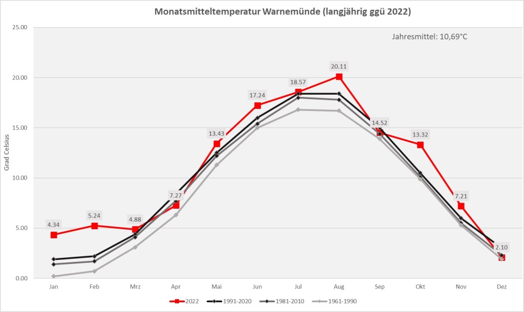 Nach Auswertung aller Stationsdaten von Warnemünde ergab sich für das Ostseebad eine Jahresmitteltemperatur von 10,69°C. Damit ist 2022 seit 2014 das 9. Jahr in Folge, welches überdurchschnittlich auch gegenüber dem neueren 30-Jahres-Mittel von 1991-2020 (+1,0 K) abschließt. Die Abweichung gegenüber dem Referenzmittel der Periode 1961-1990 lag bei rund +2,4 K. Damit reiht sich 2022 in Warnemünde auf Platz 3 der wärmsten Jahre seit Aufzeichnungsbeginn ein. 2020 (11,01°C) und 2019 (10,84°C) führen die Liste an.