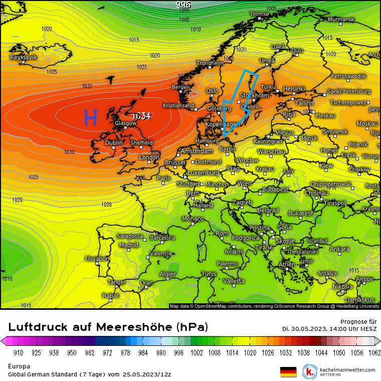 Stabiles Hochdruckwetter nun schon mit kurzen Unterbrechungen seit Anfang Mai. Der Atlantik ist weitgehend abgeriegelt durch ein sich ständig regenerierendes Hochdruckgebiet mit Schwerpunkt über der Nordsee und den Britischen Inseln, zeitweise bis nach Skandinavien.