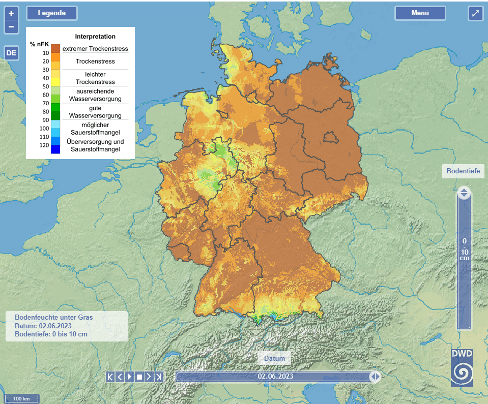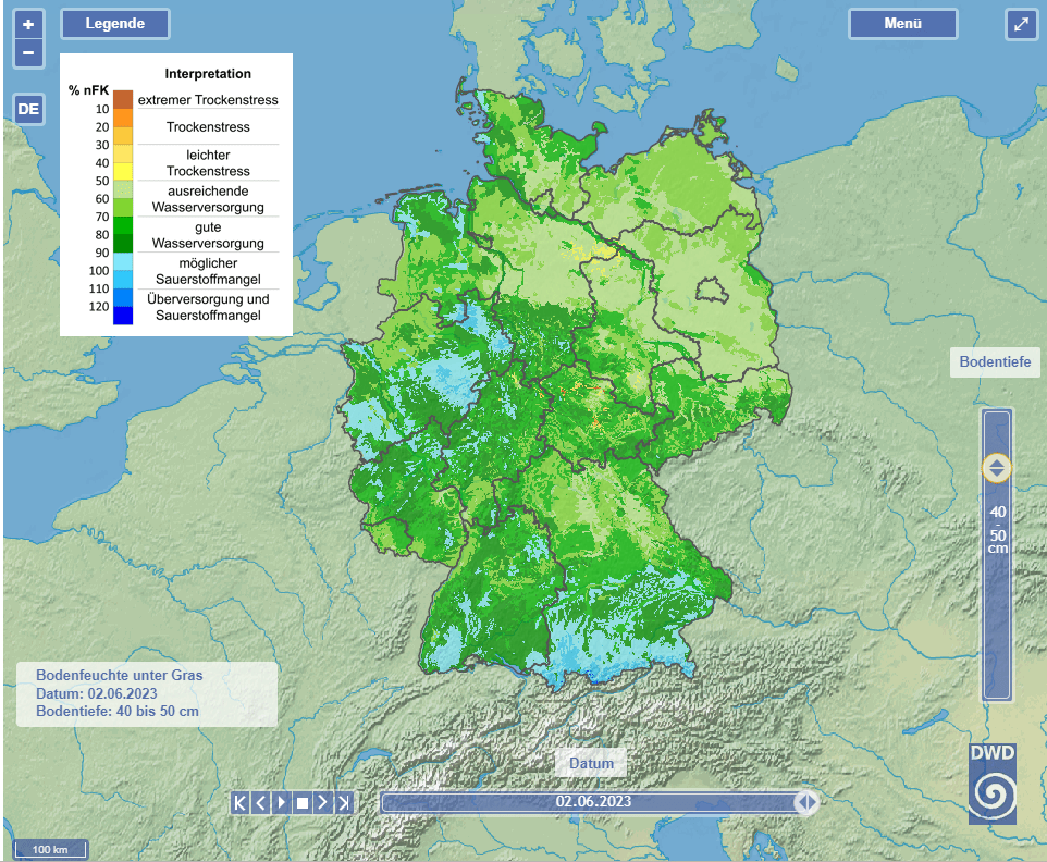 In der oberen Bodenschicht bis 10 cm Tiefe ist praktisch keine Feuchtigkeit mehr vorhanden und es besteht starker Trockenstress für die Pflanzen. Erst ab etwa 40 cm Tiefe ist die Wasserversorgung noch ausreichend. Die folgenden Grafiken verdeutlichen das für den Erdboden unter Gras: