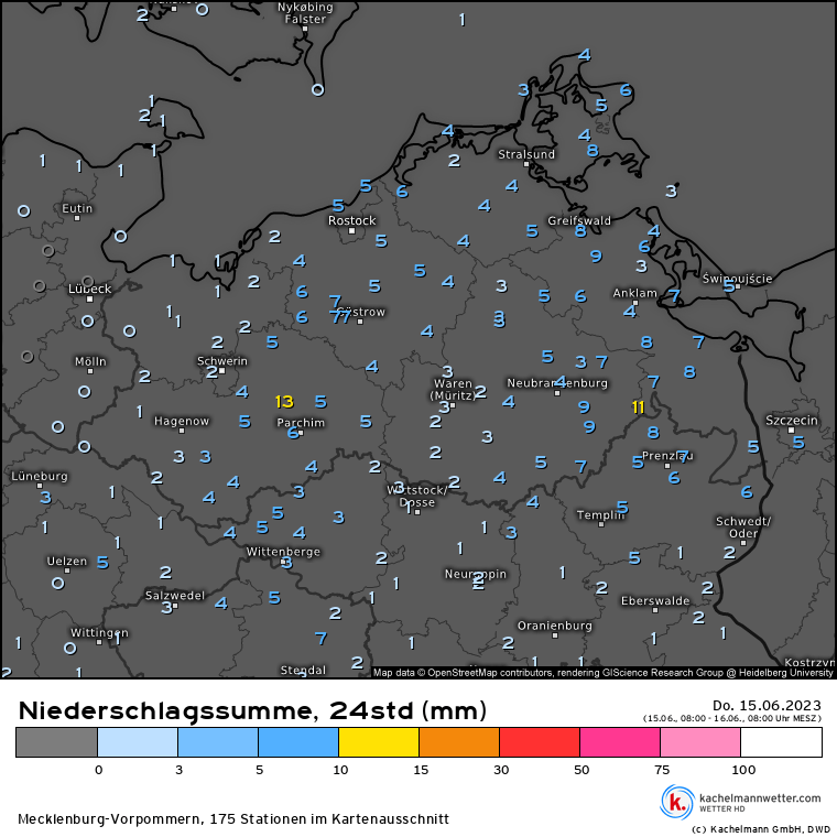 Am Abend des 14. Juni (Donnerstag) war es soweit. Vielerorts gab es die ersten Regentropfen im Statistik-Sommer 2023 (Jun/Jul/Aug) zu vermelden. Zuvor hatte es am 23. Mai geregnet, mancherorts nennenswert sogar seit dem 06. Mai (z.B. Rostock/Schwerin) oder ganz lokal 28. April (Feldberger Seenlandschaft) nicht mehr.