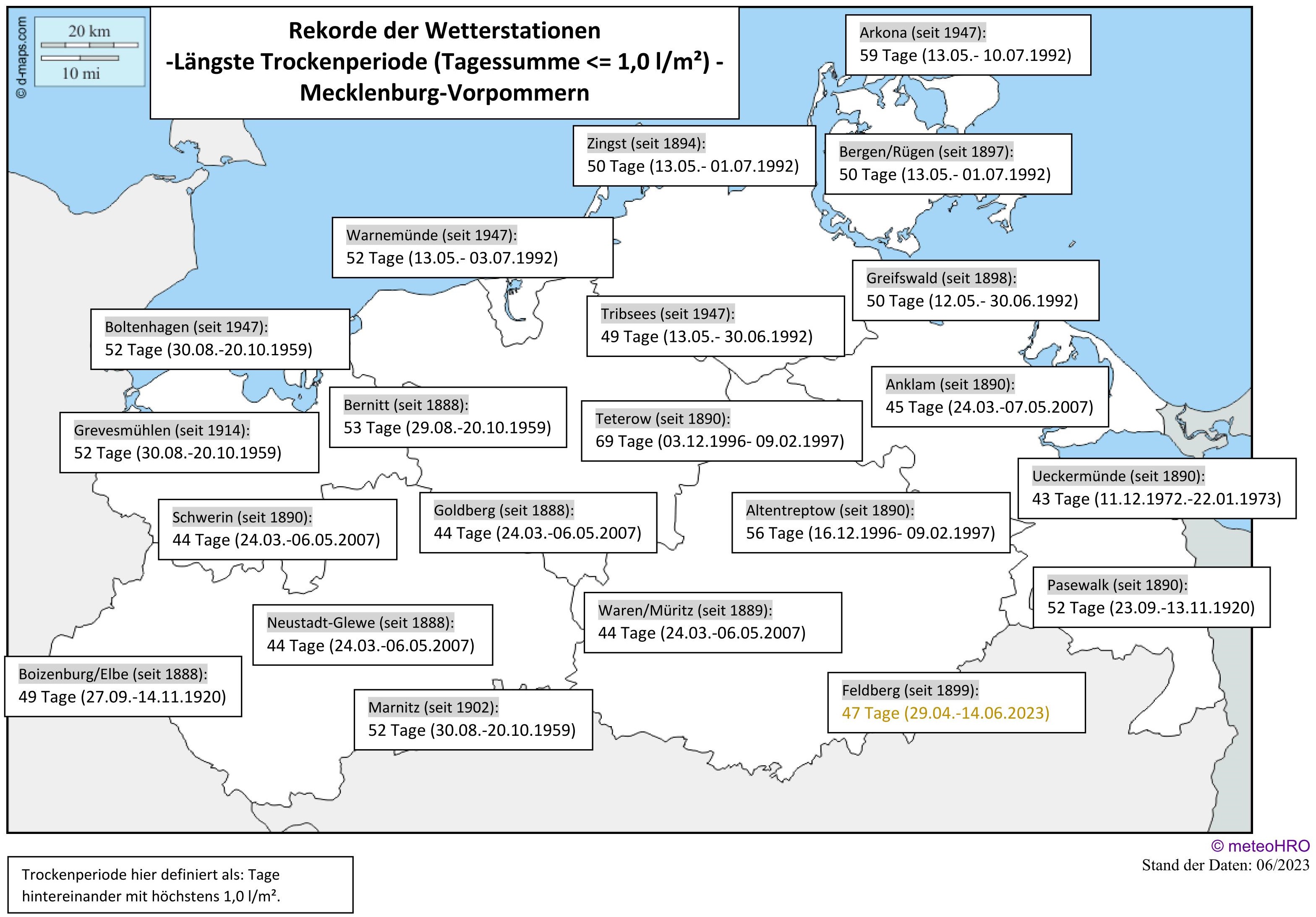 Die Karten zeigen für bestimmte Orte die Rekordmarken für die längste Trockenperiode seit Aufzeichnungsbeginn des Niederschlages. Die neuen Rekorde in Bernitt und Feldberg sind bereits eingetragen.