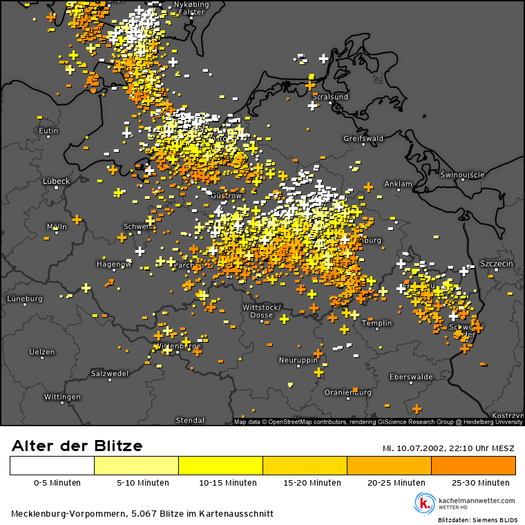 Die Blitze zwischen 21:40 und 22:10 Uhr in MV und angrenzenden Regionen. Mehr als 5.000 wurden in nur 30 Minuten registriert.