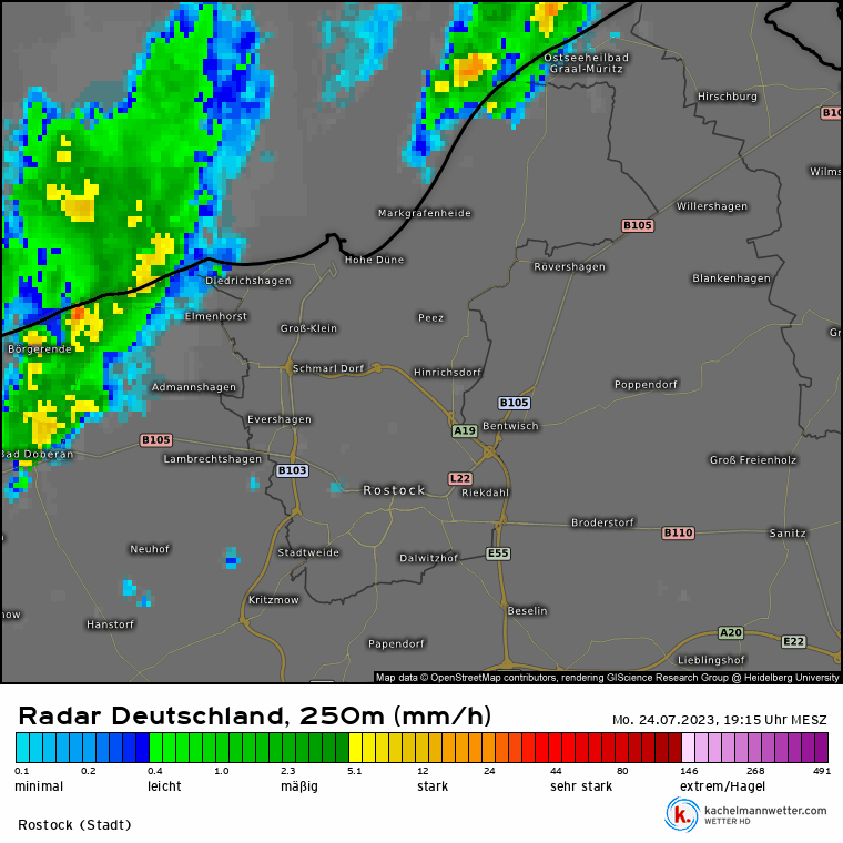 Das in Bezug auf Starkregen kräftigste Ereignis traf den Norden von Rostock. Zwischen 19:00 und 20:30 Uhr fielen 30 bis punktuell 40 l/m² im Bereich Warnemünde, Diedrichshagen und Elmenhorst. Die Gewitterzelle hatte außerdem kleinkörnigen Hagel im Gepäck und zog nur langsam ostwärts. Erschwerend kamen Neubildungen aus Zugrichtung Südwest hinzu, welche sich ebenfalls über den gleichen Orten abregneten.