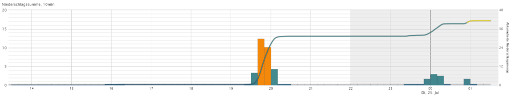 | 60 min | 24. Juli, 19:20 bis 20:20 Uhr | 30,7 l/m² | T ≈ 22 a |