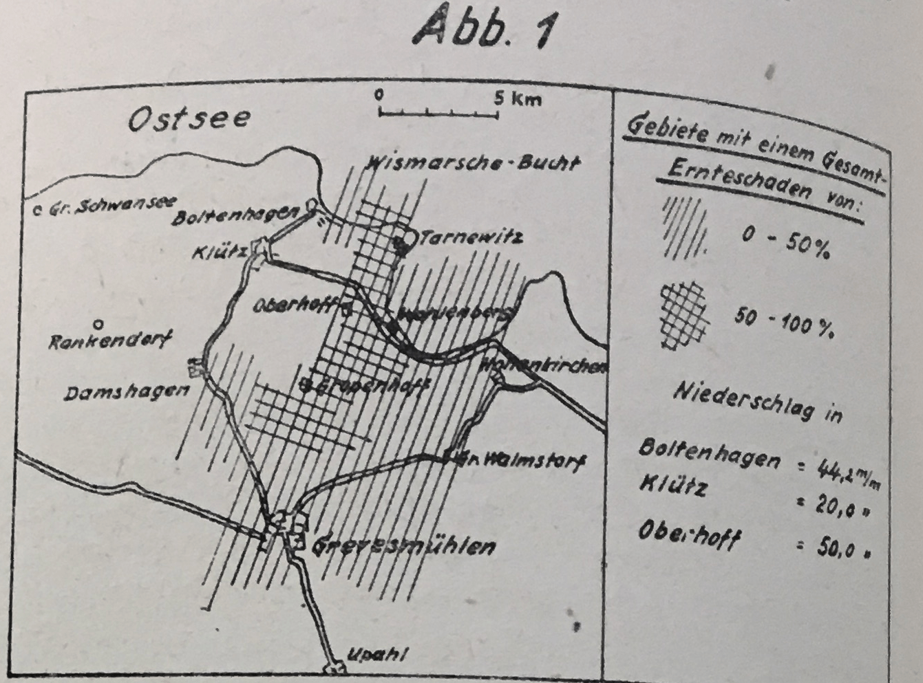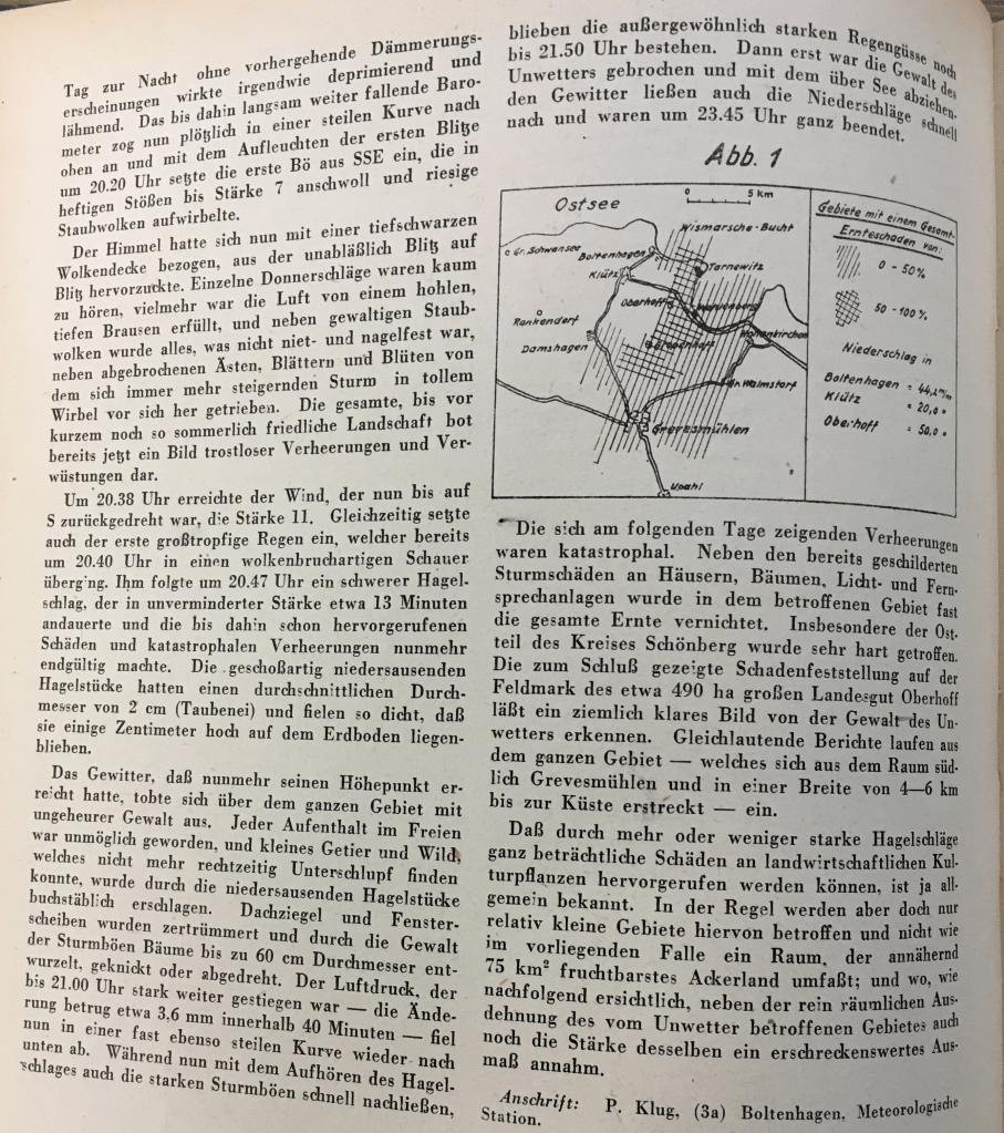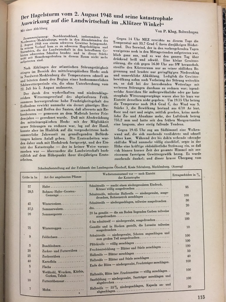 Quelle: P. Klug: Der Hagelsturm vom 2. August 1948 und seine katastrophale Auswirkung auf die Landwirtschaft im ,, Klützer Winkel “ . Zeitschrift für Meteorologie, Heft 3, 1949 , S. 115-116