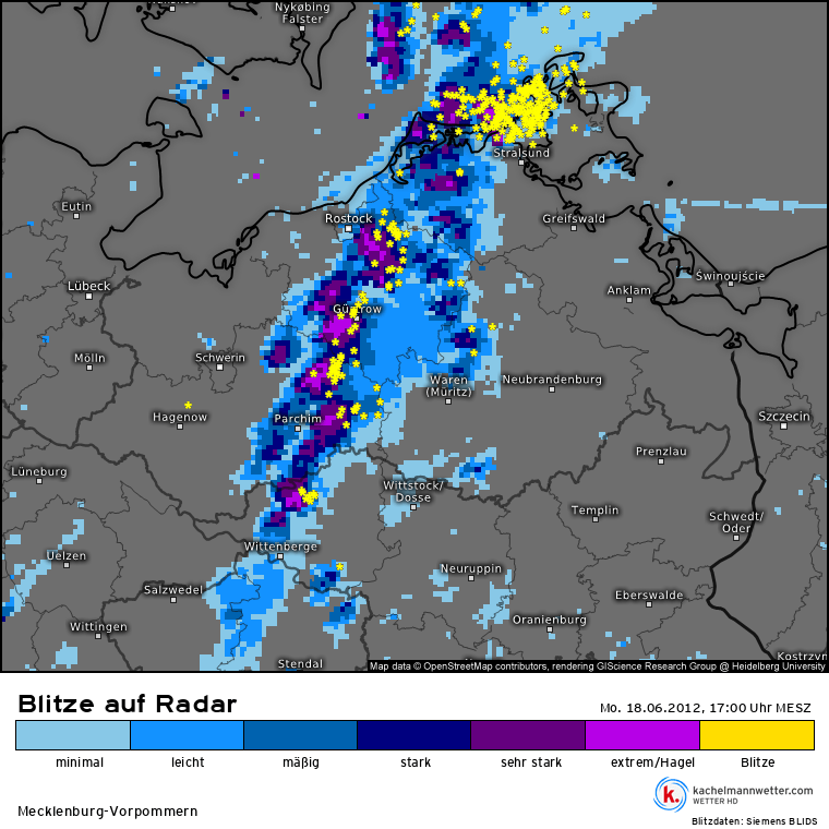Die stärkste Zelle erreichte etwa 16 Uhr Rostock und wanderte weiter zur Insel Rügen, gut erkennbar an der hohen Blitzaktivität (gelbe Punkte). Dieses Unwetter war für die großen Hagelkörnern und entsprechende Schäden verantwortlich. Weitere Gewitter entstanden dann südlich der Küstenregion und formierten sich gegen 19 Uhr zu einer Gewitterlinie im Bereich Pommersche Bucht- Usedom-Uckermark: