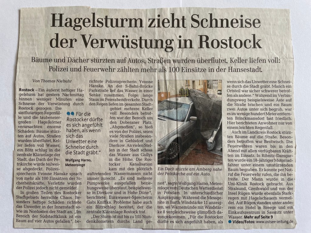 Dabei kam es insgesamt für unsere Region zu außergewöhnlichen Hagelschäden in einem Streifen vom Landkreis Rostock über den Raum Ribnitz und Barth bis in den Norden von Rügen. Dazu folgende Zusammenfassung der Hagelgilde VvaG-Versicherung:
