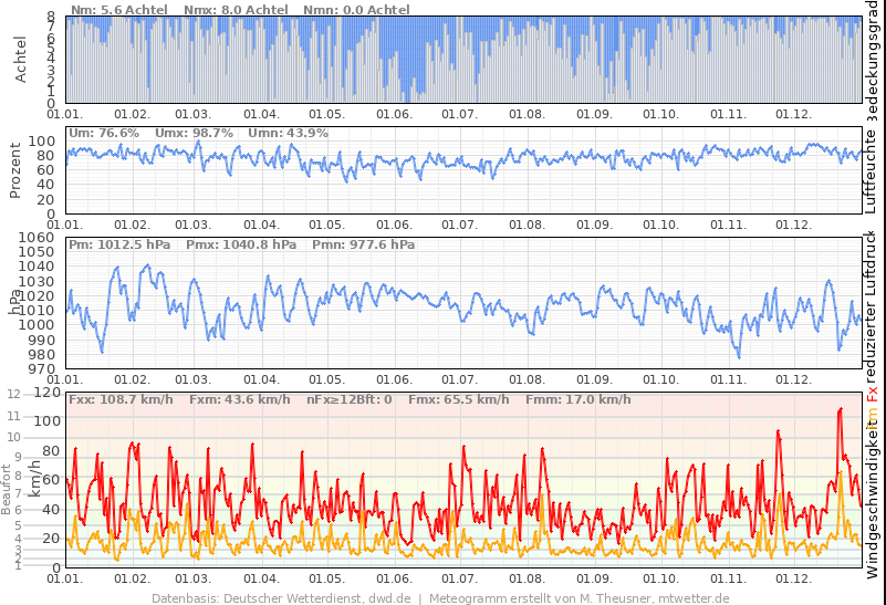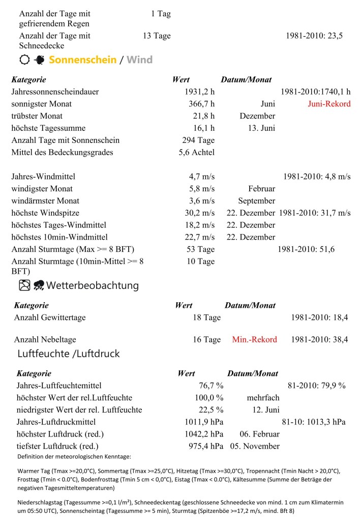 Die Analyse der Winddaten zeigt, dass 2023 diesbezüglich als ein sehr durchschnittliches Jahr einzuschätzen ist. Im Mittel wehte der Wind mit 4,7 m/s (= 16,9 km/h / BFT 3). Die Spitzenböe betrug 108,7 km/h und datiert auf den 22. Dezember (Sturmtief ZOLTAN).