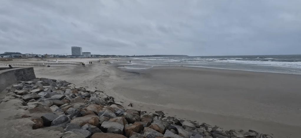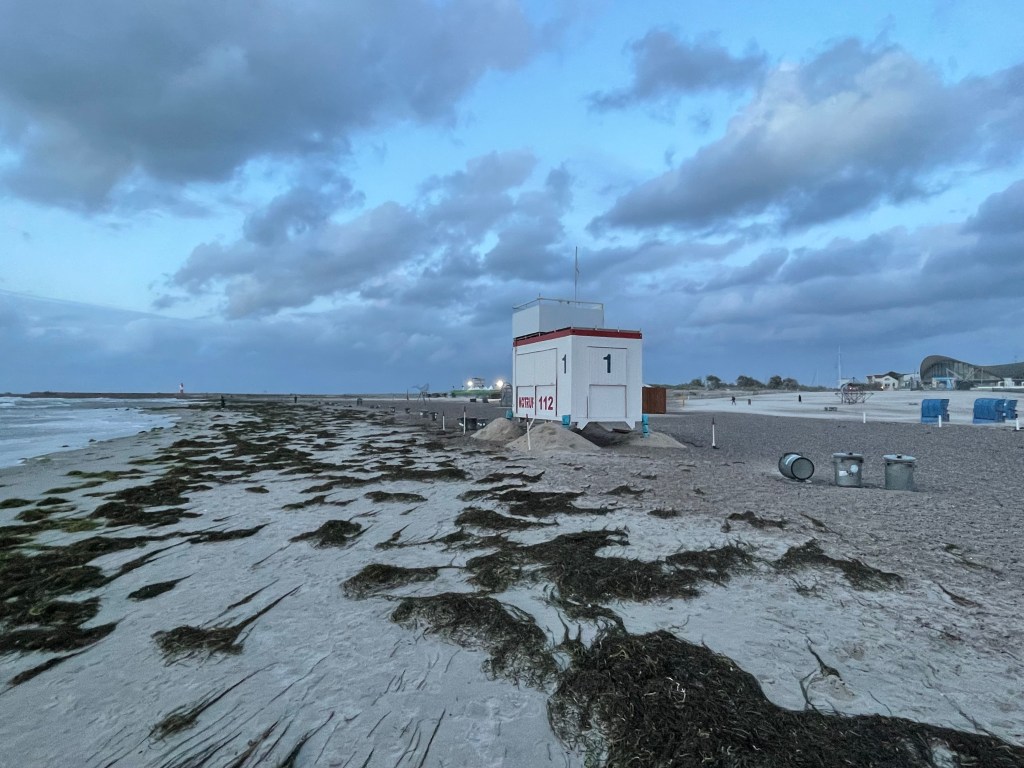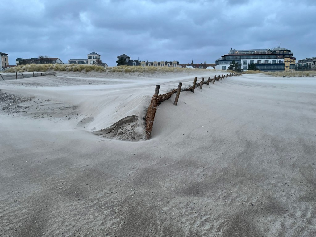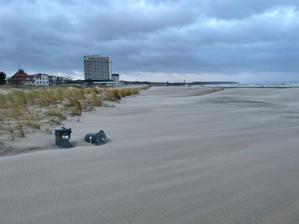 Der Warnemünder Strand wurde überspült, es bildeten sich kleine Sandinseln inmitten des Ostseewassers. Auf der Westmole peitschten die Wellen über die Felsen, am Alten Strom schwappte das Wasser zumindest leicht über die Ufer.