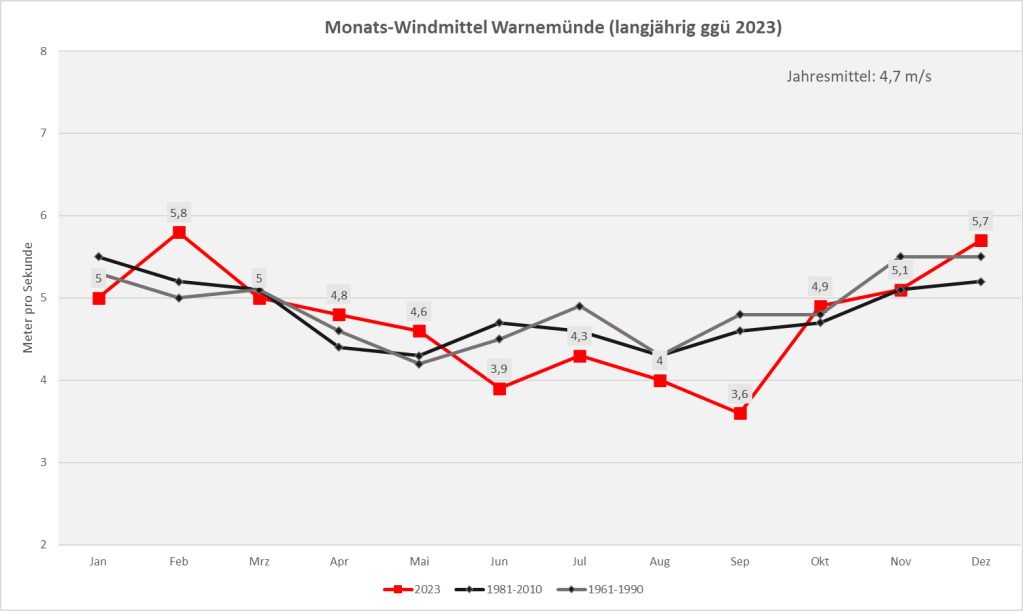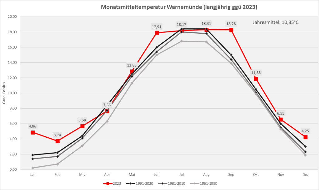 Mit einer Jahresmitteltemperatur von 10,85°C in Warnemünde fiel auch 2023 deutlich überdurchschnittlich aus. Die Abweichung gegenüber dem Referenzmittel der Periode 1961-1990 lag bei rund +2,5 K, jene im Vergleich zur Periode 1991-2020 bei etwa +1,1 K. Nur das Jahr 2020 (11,01°C) war wärmer, 2019 (10,84°C) in etwa gleich auf. 2023 ist seit 2014 das 10. Jahr in Folge, welches überdurchschnittlich auch gegenüber dem neueren 30-Jahres-Mittel von 1991-2020 abschließt.