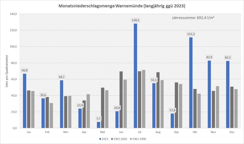 Nachdem zum Start in den Sommer 2023 Trockenheit das große Thema war, drehte es sich im Herbst in das andere Extrem um. Der Oktober war in Warnemünde mit 111,3 l/m² der nasseste seit Beginn der Niederschlagsmessreihe 1901. Auch November und Dezember fielen überdurchschnittlich nass aus, sodass der 3 Monatszeitraum Okt.-Dez. mit 274,2 l/m² ebenfalls als niederschlagsreichster seit Aufzeichnungsbeginn vor 121 Jahren abschloss. Zur Einordnung: Im langjährigen Mittel summieren sich über diesen Zeitraum etwa 147 l/m².
