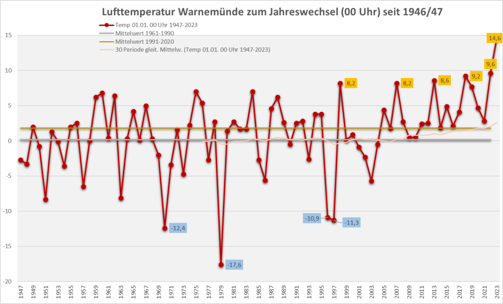 Der Jahreswechsel 2022/23 war der mildeste aller Zeiten. In Warnemünde waren es 14,6°C um exakt 00 Uhr. Und damit war schon in den ersten Minuten des Jahres ein neuer Temperaturrekord für den Monat Januar aufgestellt – mitten in der Nacht! Was für ein irrer Auftakt in 2023 aus meteorologisch-klimatologischer Sicht! Gegen 04 Uhr ging es mit der Lufttemperatur noch etwas aufwärts bis zur absoluten Spitze von 15,8°C. Die alte Höchstmarke aus dem Januar 2020 wurde gleich um 1,6 K übertroffen.