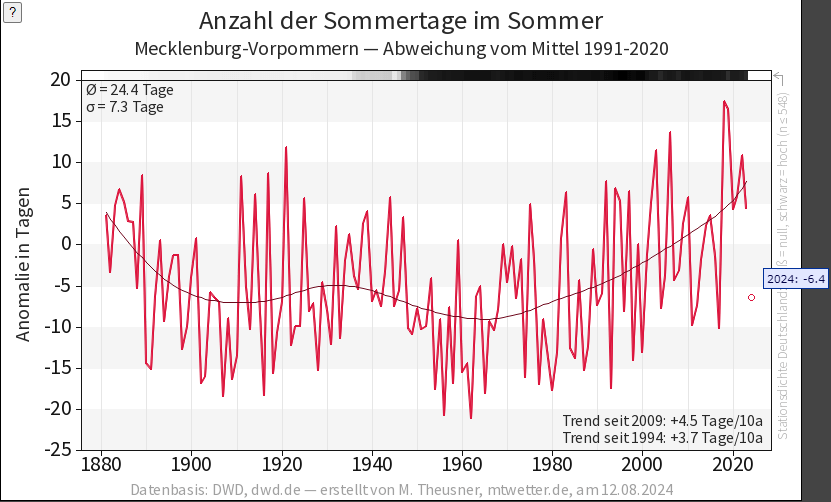 Die Abweichung zur langjährigen Anzahl der Sommertage von Juni bis August (1991-2020) beträgt für 2024 noch -6,4 Tage. Allerdings haben wir ja auch erst den 12. August.