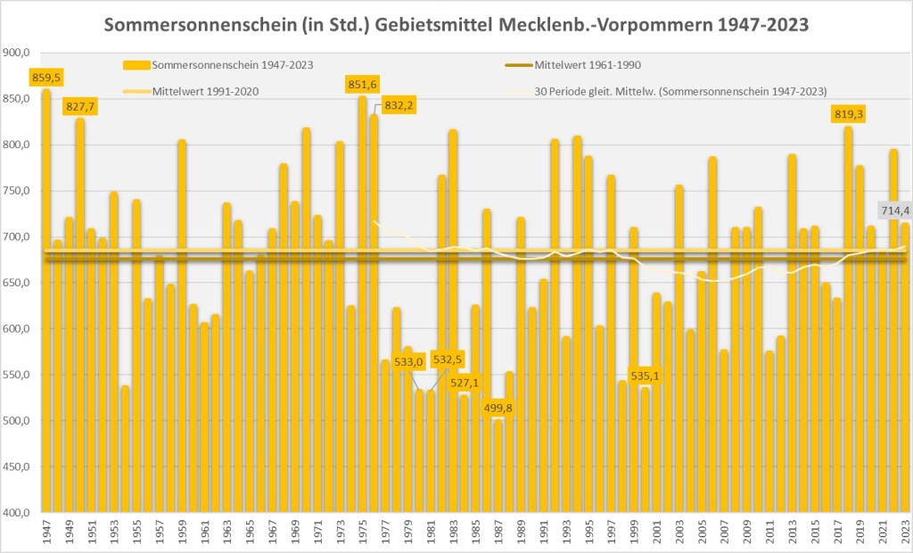 Mit bisher ca. 558 Sonnenstunden im Flächenmittel liegt MV hier ebenfalls im durchschnittlichen Bereich (1961-90: 676 h, 1991-20: 685 h). Die noch fehlenden rund 120 h dürften noch zu schaffen sein bis Ende August.