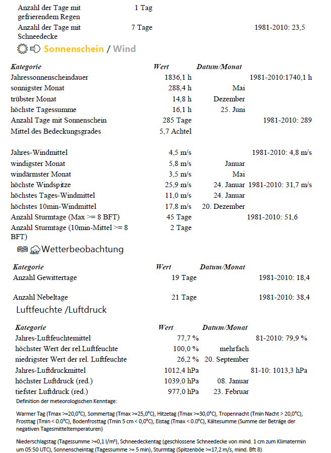 Die Anzahl der Gewittertage lag mit 19 im Normalbereich, am meisten Blitz und Donner ist im Mai verzeichnet worden (7 Gewittertage). Nebel trat an 21 Tagen auf – damit setzt sich der Trend einer Abnahme der Nebeltage fort.