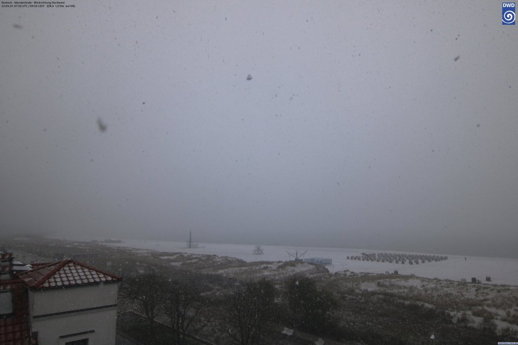 Schneefall am Morgen des 22. April 2024. Zeitweise bildete sich sogar eine dünne Schneedecke in Warnemünde.
