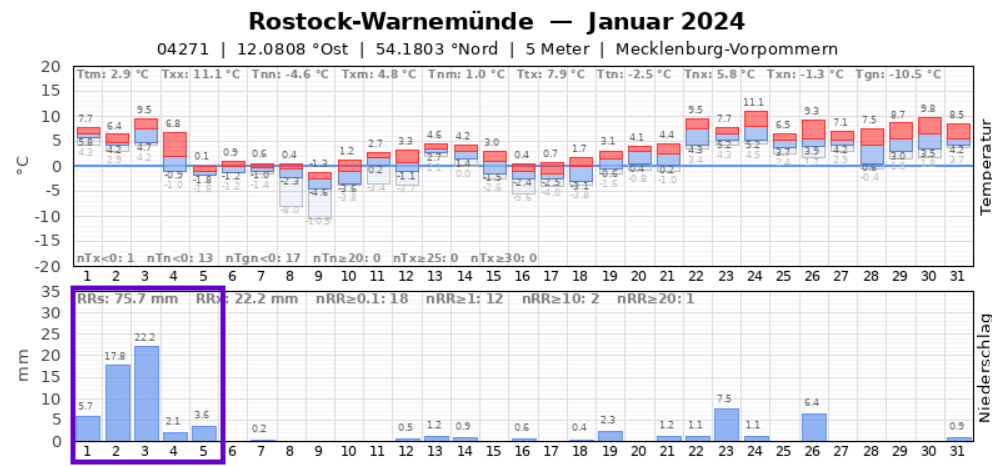 Das Jahr 2024 startete so nass wie noch nie seit Niederschlag in Warnemünde aufgezeichnet wird (seit 1901). Nach den ersten 5 Tagen waren 51,4 l/m² zu verbuchen! Bereits am 04.01. war das Niederschlagssoll für den Monat Januar erreicht.