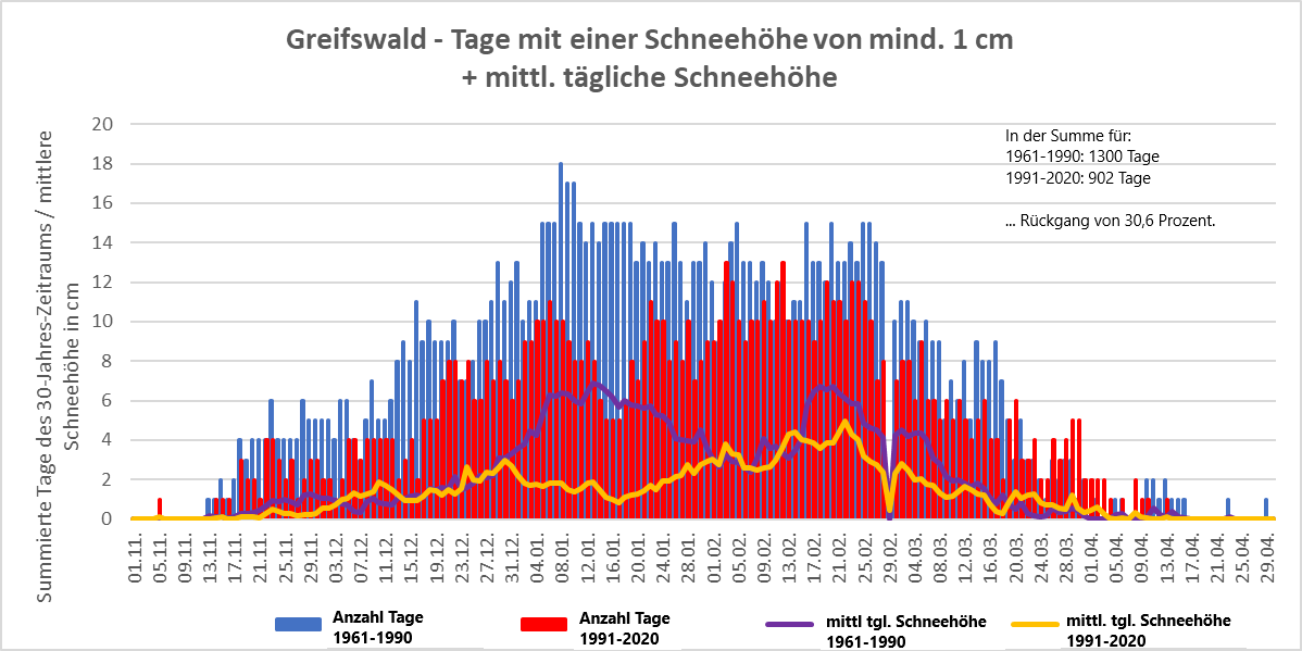 Die folgende Abbildung zeigt die Verteilung der Anzahl der Schneedeckentage (mind. 1 cm, summiert) in Greifswald im Verlauf der Wintersaison, hier November bis April. Es wurde für jeden Tag vom 01.11. bis 30.04. gezählt, wie oft in den jeweiligen 30-Jahreszeiträumen 1961-1990 (blau) und 1991-2020 (rot) an diesem Datum eine Schneedecke um 07 Uhr registriert wurde. So ergibt sich für den Zeitraum 1961-1990 ein Wert von insgesamt exakt 1300 Schneedeckentagen. Für den Zeitraum 1991-2020 sind es dagegen nur 902 Tage. Das entspricht einem Minus von 398 Tagen oder eben einen Rückgang von 30,6 Prozent!