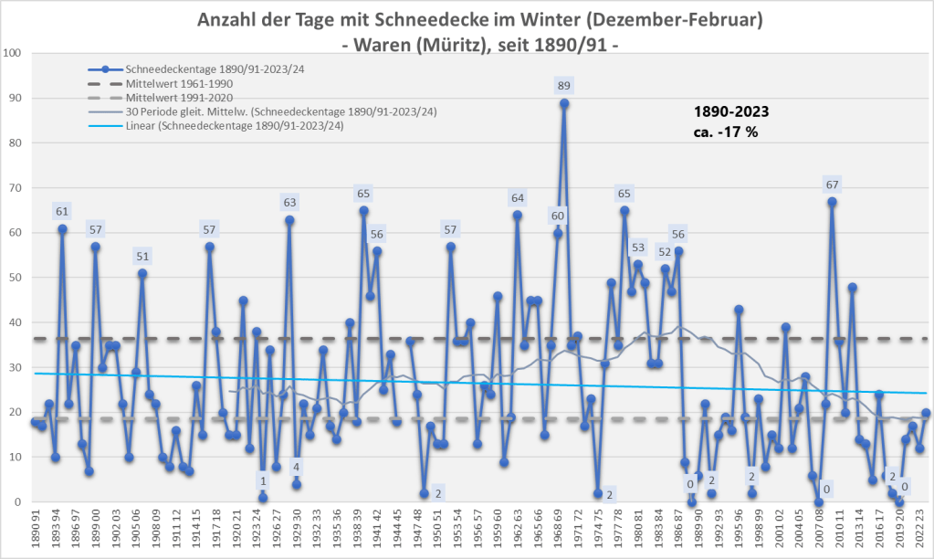 Schauen wir auf die Anzahl der Schneedeckentage an den zwei ausgewählten Stationen Ostseeheilbad Zingst (seit 1925) direkt an der Küste und Waren (Müritz) im Süden von Mecklenburg (seit 1890). Für beide Orte ist zum einen der sogenannte dreimonatige Statistikwinter der Meteorologie/Klimatologie (01. Dezember bis 28./29. Februar) als auch der gesamte Zeitraum der Wintersaison (01. Oktober bis 30. April) ausgewertet worden.