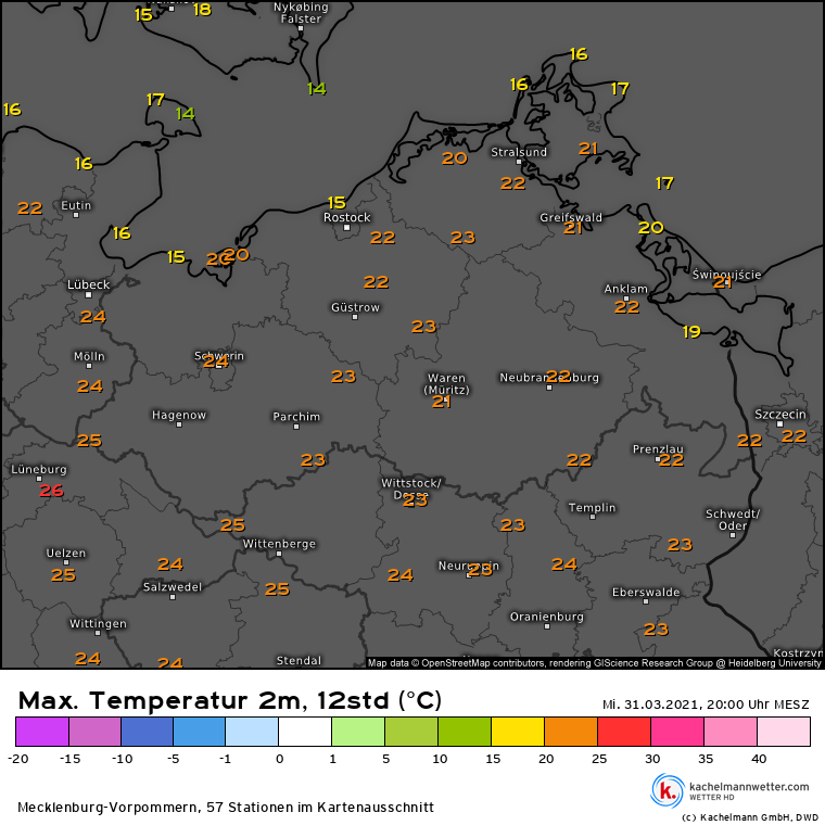Übertroffen wurde der Landesrekord jedoch vor 3 Jahren am 31.03.2021, als eine fast schon frühsommerliche Luftmasse auch den Norden Deutschlands erreichte und den Temperatursensor der Station Boizenburg in der Spitze 24,6°C melden ließ. An der Küste verhinderte Seewind neue Höchstmarken.