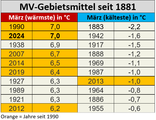 Während in der ersten Monatshälfte in Ausnahmefällen noch sehr strenger Frost unter -20°C auftreten kann, ist zum Monatsende bereits sommerliche Wärme von knapp 25°C möglich. Der Kälterekord von -25,3°C, gemessen am 07.03.1931, hat seinen Ursprung an der ehemaligen Neubrandenburger Station. Die höchste Märztemperatur stammte viele Jahre mit 24,4°C aus Ueckermünde, gemessen am 30.03.1968. An den meisten Wetterstationen im Land datierte oder datiert weiterhin der März-Wärmerekord auf diesen Tag.