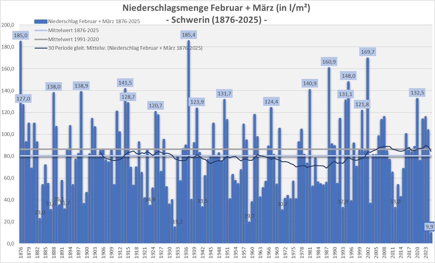Damit war der 2-Monatszeitraum in der Landeshauptstadt so trocken wie noch nie seit Beginn von Aufzeichnungen. Die bis auf wenige Kriegsjahre (1943-1945) lückenlose Schweriner Niederschlagsmessreihe beginnt im Jahr 1876. Diese Trockenphase so früh im Jahr ist demzufolge außergewöhnlich. Etwas mehr Niederschlag im Februar + März kam mit 20 bis 30 l/m² in Vorpommern runter.