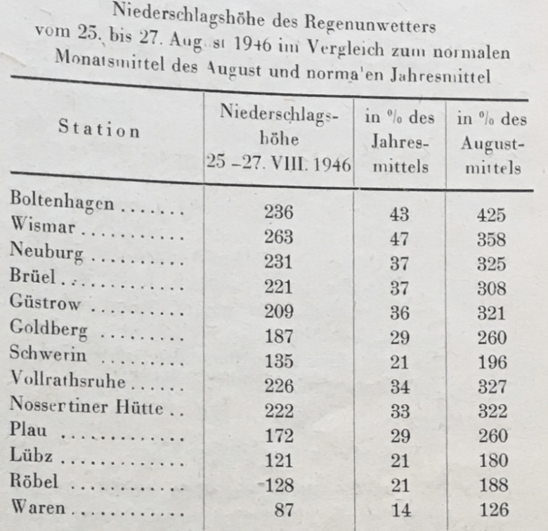 „Nach einer zweitägigen Regenpause in dem maritimen Witterungsverlauf des August fiel von den Morgenstunden des 25. August 1946 an in wechselnder Stärke mit Unterbrechungen leichter bis mäßiger Regen bis zum Nachmittag. Nach mehrstündiger Unterbrechung setzte in den Abendstunden des 25. August abermals Regen in wechselnder Stärke ein, der sich zeitweise zu wolkenbruchartiger Heftigkeit steigerte und in ununterbrochener Dauer bis zum Abend des 27. August anhielt. Mit großer Stärke fiel der Regen aus ständig tief verhangenem Himmel besonders im Nordwesten von Mecklenburg ohne wesentliche Schwankungen vom Nachmittag des 26. bis zum Mittag des 27. August nieder. Mit 46 Stunden Dauerregenzeit, von 22 Uhr des 25. bis 20 Uhr des 27. August 1946, ist dieses Regenunwetter die längste beobachtete Dauerregenperiode, die in dieser Stärke in unserem Gebiet aufgetreten ist, soweit meteorologische Überlieferungen vorliegen.