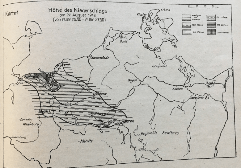 „Das Gebiet, innerhalb dessen allein am 27. August 1946 in der Frühe um 7 Uhr mindestens 100 mm Regen gemessen wurden, ist weit über 4000 qkm groß, umfaßt also rund das 4½fache des Flächeninhalts der Insel Rügen, der größten deutschen Insel. Die Grenzlinie, die dieses Gebiet umschließt, verläuft vom Klützer Winkel über Hackensee-Roggenstorf, östlich Grevesmühlen über Mühlen-Eichsen, Stralendorf nach Holthusen, geht dann in Richtung Lübz in westöstlichem Verlauf auf Plau, schließt einen Teil der Mecklenburgischen Seenplatte bis zum Müritzsee ein und führt dann in einem im wesentlichen nordwestlichen Verlauf über Schwinkendorf, östlich Güstrow, Schwaan, Neubukow zur Küste zurück. Es zeigt sich also eine sehr starke Ausbuchtung nach Osten im Gebiet des Landrückens. Außer im Raum um die Wismarer Bucht liegt ein zweites Maximalgebiet des Niederschlags in dem großen Waldgebiet nördlich der großen Mecklenburgischen Seen. Ein Gebiet geringerer Niederschlags innerhalb der mindestens 100-Millimetergrenze liegt zwischen Güstrow und Goldberg in dem nur maximal 75 m hoch gelegenen Seenbecken um Lohmen. Die Umgrenzung des Gebietes, das mindestens 100 mm Starkregen bis zum 27. August empfing, verläuft nicht geradlinig, sondern mit zahlreichen Ein- und Ausbuchtungen. Die größte Ausdehnung des Niederschlagsraumes auf dem Festland beträgt in nordwest—südöstlicher Richtung ca. 125 km, in der größten Breite von Westen nach Osten rund 70 km. Auf dieser Fläche sind also innerhalb 24 Stunden von 7 Uhr des 26. bis 7 Uhr des 27. August über 500 Millionen m³ Regen niedergegangen. Diese Regenmenge entspricht dem 10. Teil der gesamten Wassermenge des größten deutschen Sees, des Bodensees (Fläche ca. 500 km², größte Tiefe 252 m, größte Breite 15 km, Länge des Obersees ca. 50 km).“