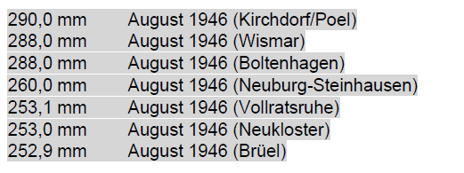 Sehr ärgerlich ist in diesem Zusammenhang auch, dass der Tageswert vom 26.08.46 von der Insel Poel nirgends aufzufinden ist, er würde den jetzigen „Rekord“halter der seit 1852 geführten RR-Reihe und höchstwahrscheinlichen Zweitplatzierten (89 mm an der Klima- bzw 94 mm an der Niederschlagsstation Poel vom 07./08.08.1963) sicherlich um rund 100 mm und damit exorbitant übertreffen.