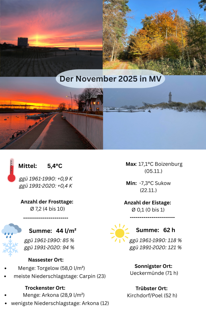 🌡️Mitteltemp. von 5,4 °C ➡️ insgesamt nahezu durchschnittlich, Monatsbeginn / -mitte sehr milde Tage mit >15°C. Danach jedoch erste Frühwinterperiode und dadurch Abbau der bis dahin deutlich zu milden Mitteltemperatur.