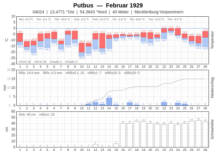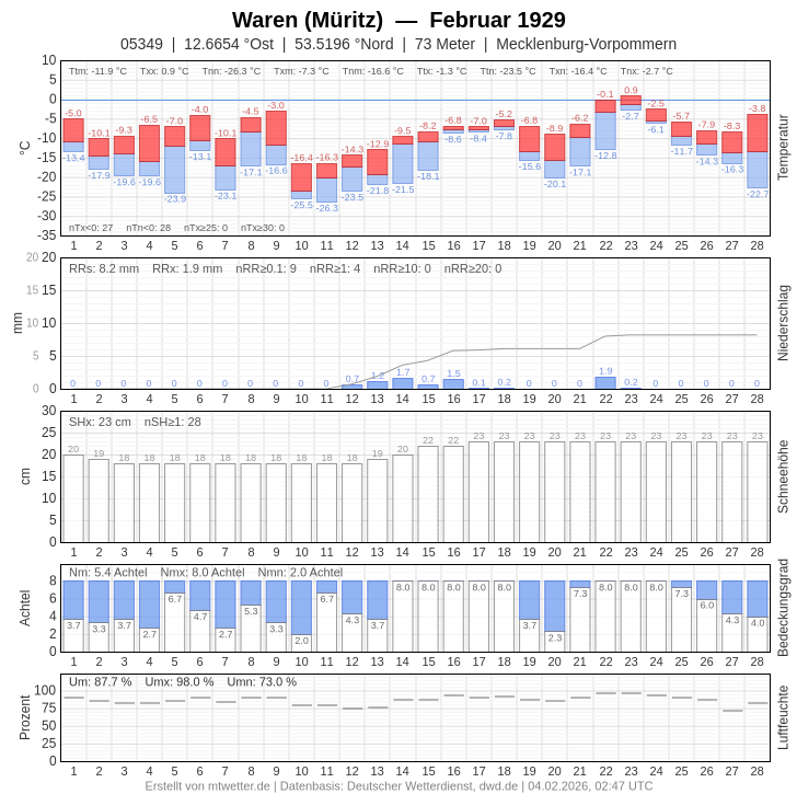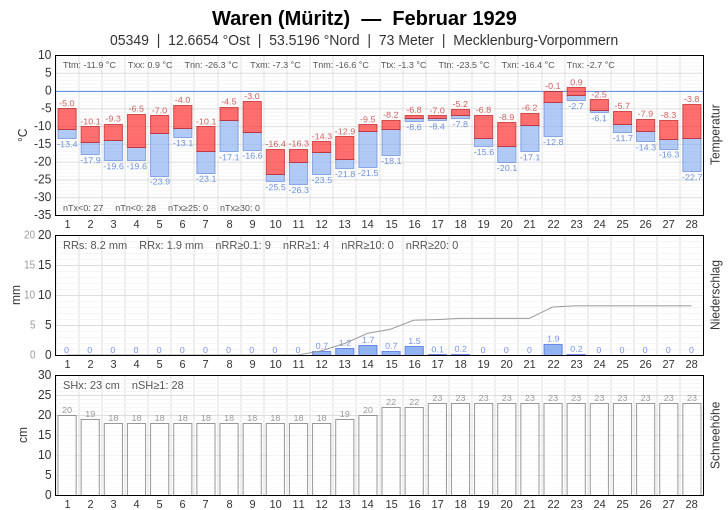 Die täglichen Messungen aus dem Februar 1929 von Temperatur, Niederschlagsmenge und Schneehöhe für die ausgewählten Wetterwarten Waren an der Müritz und Putbus auf Rügen.