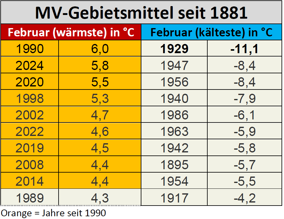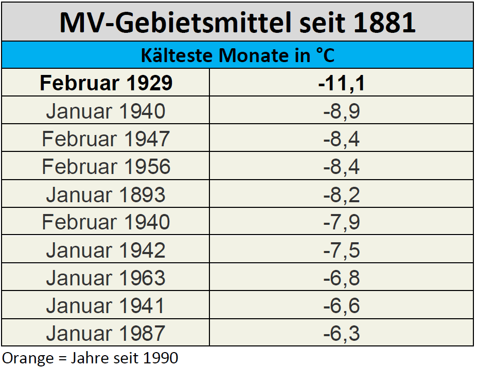 Die folgende Liste zeigt die tiefsten gemessenen Lufttemperaturen vom Februar 1929 aus MV und dem angrenzenden Polen sowie Brandenburg und Schleswig-Holstein.
