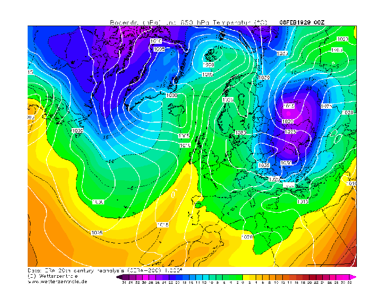 Anfang/Mitte Februar 1929 erreichte die historische Kältewelle ihren Höhepunkt. Am 2. Februar zeigte das Thermometer zum ersten Mal in jenem Winter unter -20°C an, am Folgetag sogar verbreiteter auch in Städten wie Rostock und Neubrandenburg. Am 10./11. Februar wurde dann das Rekord-Minima von -31,0°C in Neubrandenburg gemessen. Ursache war ein sich aufbauendes neues, riesiges Kontinentalhoch, das sich nach Westen ausdehnte. Ende Januar/Anfang Februar ist der gesamte Raum von Sibirien bis Westeuropa von sehr hohem Luftdruck dominiert gewesen, in der kontinentalen Kaltluft herrschten über Russland Temperaturen um –50 °C, diese Luftmasse ist durch anhaltende Ostströmung ohne nennenswerte Abschwächung immer wieder nach Mitteleuropa geführt worden. Die ganze nordhemisphärische Zirkulation ist völlig aus den Fugen geraten. Während sich der Luftdruck über Grönland und den angrenzenden Regionen wegen der maritimen – und damit weniger günstigen – Bedingungen zeitweise etwas abschwächte, stieg der Kerndruck im kontinentalen Bereich der Antizyklone vorübergehend sogar über 1060 hPa! Einzelne Hochdruckkerne lösten sich vom großen Hoch ab und zogen nach Westen direkt in Richtung Deutschland. Tagelang, ja wochenlang, bleibt die Antizyklone über Skandinavien bestehen und hielt nahezu ganz Europa in eisiger Starre. Ein kräftiges Tief über dem Atlantik schien ebenfalls „ratlos“ zu sein und irrte auf ungewöhnlicher Zugbahn um den 40. Breitengrad herum – es gab kein Durchkommen.
