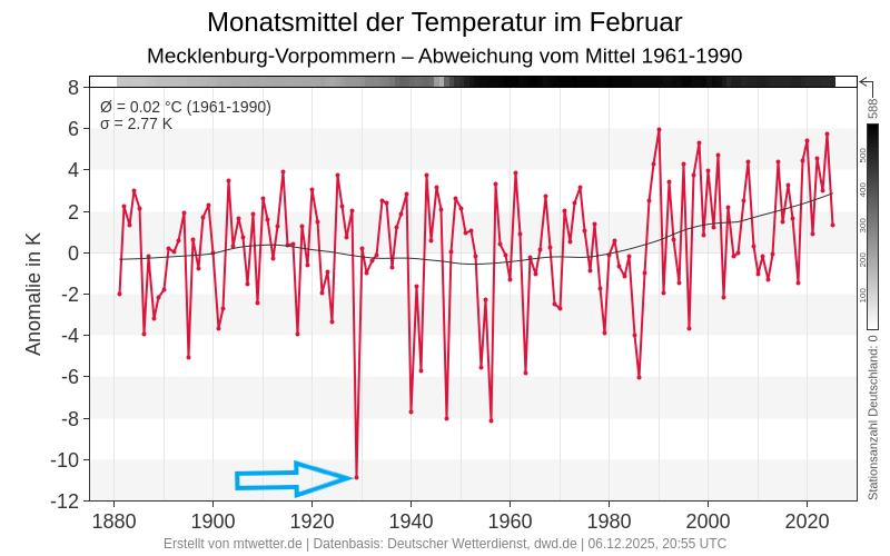 Zur Einordnung der Dimensionen der Kälte helfen auch Vergleiche mit winterlich-frostigen Monaten der jüngeren Vergangenheit. Der Dezember 2010, wir erinnern uns – mit flächig weißen Weihnachten -, brachte es auf -4,3°C Durchschnittstemperatur in MV, der Februar 2012 mit markanter Kältewelle auf -1,3°C. Da spielte der Februar 1929 doch in einer ganz anderen Liga. Dies verdeutlicht ergänzend der Blick auf das vieljährige Klimamittel. Dieses berechnet sich für Monat Februar in der Periode 1961-1990 mit exakt 0,0°C. Die negative Abweichung des 1929er Februar betrug somit unglaubliche 11°C! Auch die Zeitreihe der Februar-Mitteltemperatur seit 1881 in Diagrammform visualisiert sehr deutlich, wie markant der 1929er heraussticht.
