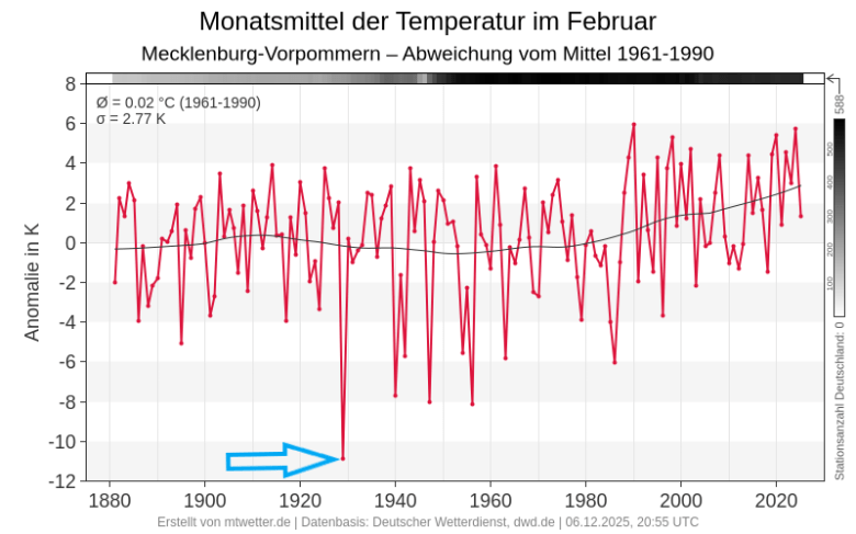 Der absolute Tiefstwert der Lufttemperatur von -31,0°C am 11.02.1929, gemessen an der Station Neubrandenburg, ist der zweitniedrigste bekannte Wert für das Gebiet von Mecklenburg-Vorpommern. Nur am 02.02.1940 war es noch kälter in Ueckermünde mit -32,5°C.