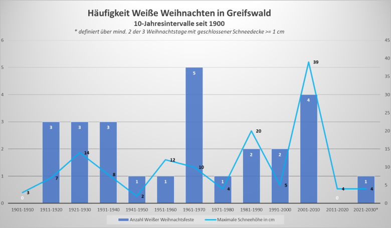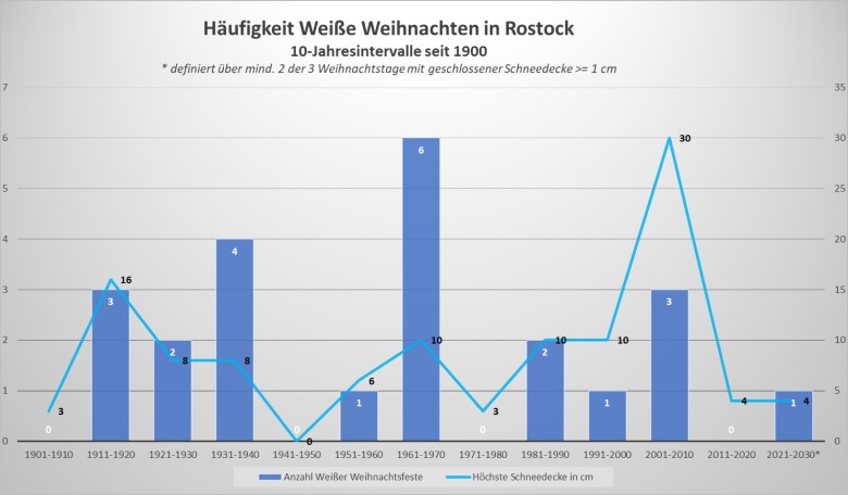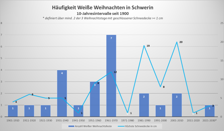 Das folgende Diagramm zeigt die Anzahl Weißer Weihnachtsfeste, gemessen daran ob mindestens an 2 der 3 Weihnachtstage (24.-26.12.) eine messbare/geschlossene Schneedecke lag, in den einzelnen Jahrzehnten seit 1901 für die Landeshauptstadt Schwerin. Zudem ist jeweils die höchste Schneedecke an einem Weihnachtstag im jeweiligen Jahrzehnt abgetragen. Auffallend ist: Weihnachten mit verschneiter Landschaft ist immer schon eher die Ausnahme als die Regel gewesen. Eine außergewöhnliche Häufung weißer Feste in Schwerin gab es von 1960 bis 1970. Von 2011 bis 2020 waren dagegen 10 Jahre schneefrei, ebenso allerdings auch in den 1970ern. Und von 1901 bis 1930 gab es insgesamt nur 3 mal Weiße Weihnachten. Erkennbar außerdem: Weihnachten mit der höchsten Schneedecke war in den Jahren 2010 (bis 20 cm) und 1986 (bis 19 cm). Deutlich häufiger kam Weihnachten in den 1930er und 1960er-Jahren weiß daher, aber eben nicht mit einer Schneedecke von so großer Mächtigkeit. Diese Zahlen sind jedoch alle auf das Beispiel Schwerin bezogen, in anderen Regionen von Mecklenburg und Vorpommern kann es schon anders aussehen.