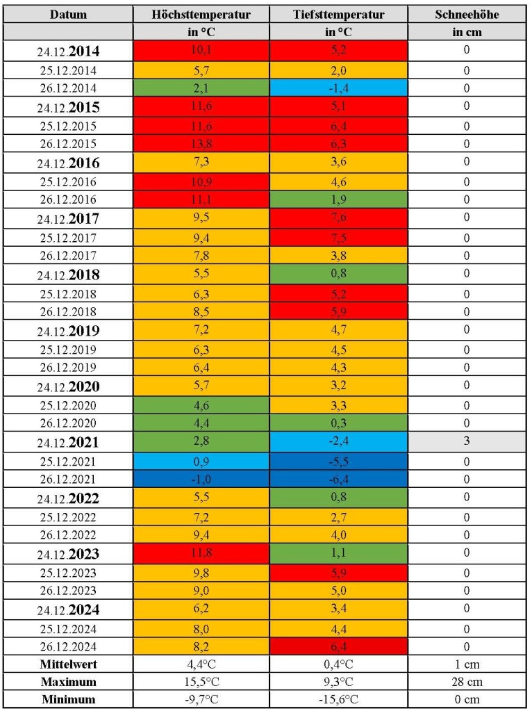 Insgesamt lief anschließend seit 2011 eine „Mild-Serie“ mit zehn schneefreien Festen in Folge. In Bezug auf den Schnee ist dies in der Messreihe seit 1947 aber nicht einzigartig: Auch von 1947 bis 1955 (9 Jahre) war die Landschaft zu Weihnachten grau, im Zeitraum 1971 bis 1980 sogar ebenfalls 10 Jahre hintereinander. Bemerkenswert ist eher die Milde der Luftmasse, in der Tabelle gut an der Dominanz der Rotfärbungen zwischen 2011 und 2018 zu erkennen. So wurden im Rostocker Ostseebad 2011, 2013, 2015 und 2016 zweistellige Plusgrade am 25.12. gemessen. Frost gab es dagegen bezogen auf die letzten 14 Feste nur am zweiten Weihnachtsfeiertag des Jahres 2014 und dann zum kalten Weihnachtsfest im Jahr 2021. Das Weihnachtsfest 2023 hielt auch wieder Plusgrade über 10°C bereit und im vergangenen Jahr 2024 dominierten ebenso recht milde Luftmassen zu den Weihnachtstagen.