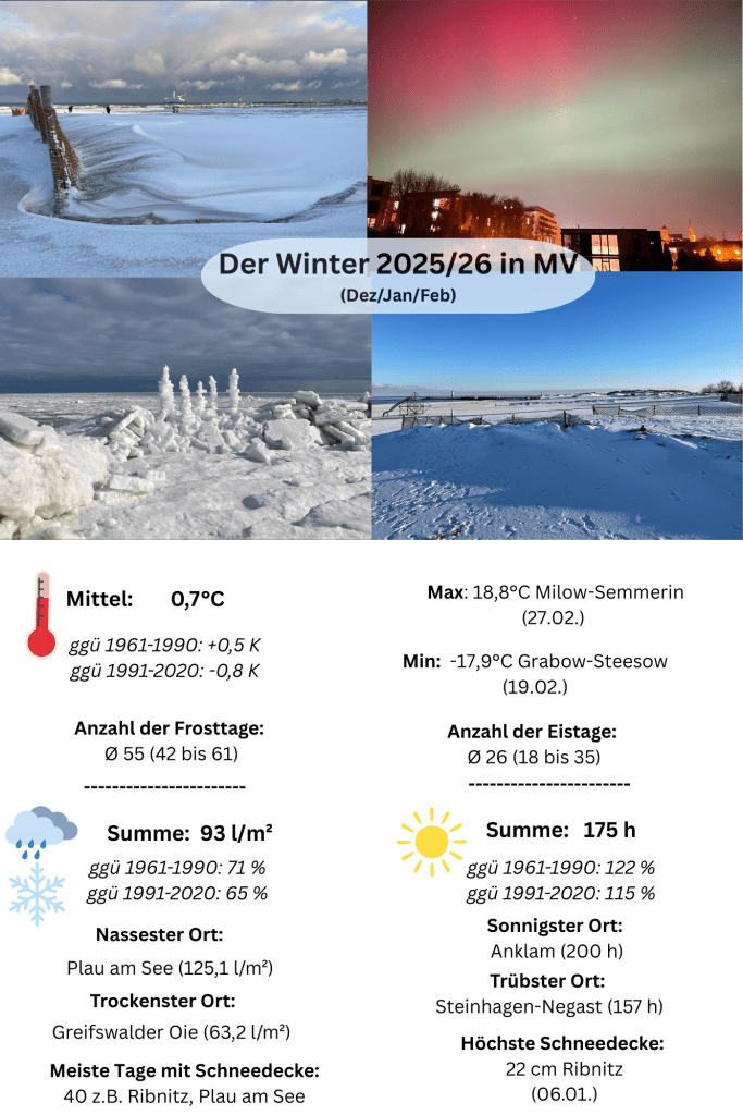 Die Anzahl der Eistage (Tmax <0,0°C) lag mancherorts mit 25 bis 35 so hoch wie seit 2010/11 nicht mehr. In Kombination mit der spektakulären Ostseevereisung an den vorpommerschen Küsten sowie bis zu 40 Schneedeckentagen (vielerorts Maximum seit 2012/13) war es für die jüngere Vergangenheit ein bemerkenswerter Winter und Freunde des gepflegten Winterwetters mit Eis und Schnee kamen ordentlich auf ihre Kosten. Besonders waren auch viele Eisregenereignisse mit teils massiver Vereisung von Straßen/Wegen, sonstiger Infrastruktur und Vegetation. Die Zahl der Tage mit gefrierendem Regen seit Jahresbeginn lag lokal bei über 10!