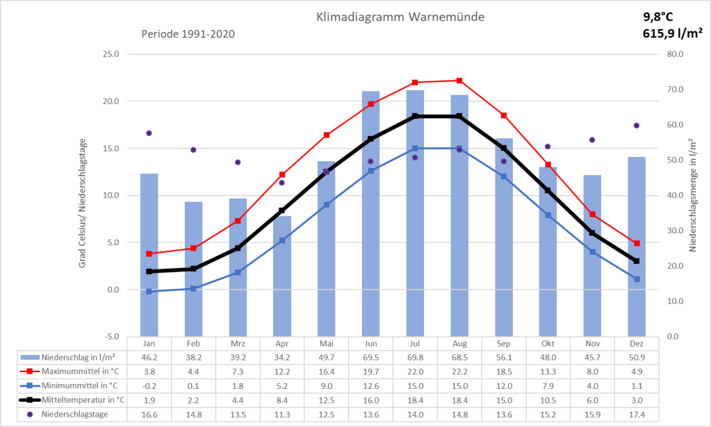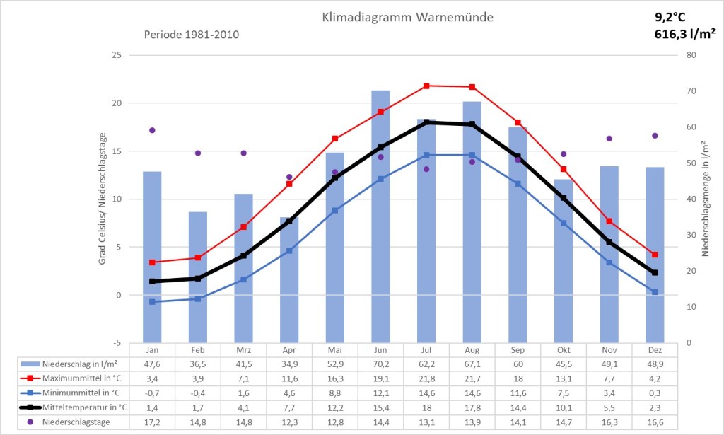 Nach dem Referenzzeitraum 1981-2010 liegt die Jahresmitteltemperatur von Warnemünde bei 9,2°C. An 55 Tagen im Jahr muss mit Frost gerechnet werden, an gemittelt 18 Tagen steigt das Thermometer auf sommerliche Temperaturen von mindestens 25°C an. Während auf den Inseln meist erst der August der wärmste Monat des Jahres ist, liegt in Warnemünde der Juli (18,0°C) im Mittel leicht vorn. Der kältete Monat ist im Rostocker Ostseebad in der Regel der Januar (1,4°C).