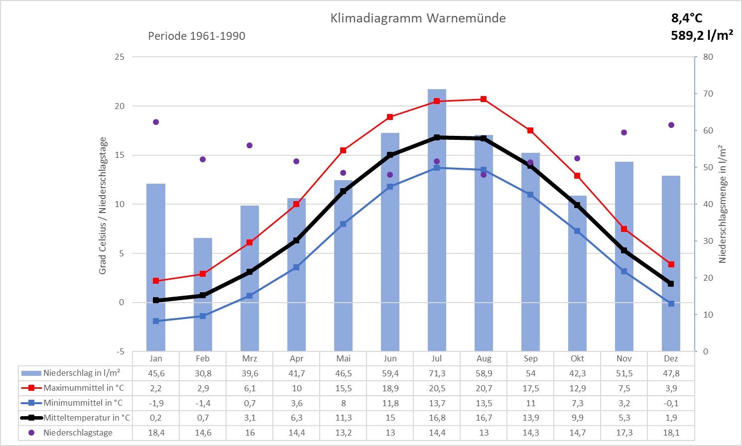 Nach dem Referenzzeitraum 1981-2010 liegt die Jahresmitteltemperatur von Warnemünde bei 9,2°C. An 55 Tagen im Jahr muss mit Frost gerechnet werden, an gemittelt 18 Tagen steigt das Thermometer auf sommerliche Temperaturen von mindestens 25°C an. Während auf den Inseln meist erst der August der wärmste Monat des Jahres ist, liegt in Warnemünde der Juli (18,0°C) im Mittel leicht vorn. Der kältete Monat ist im Rostocker Ostseebad in der Regel der Januar (1,4°C).