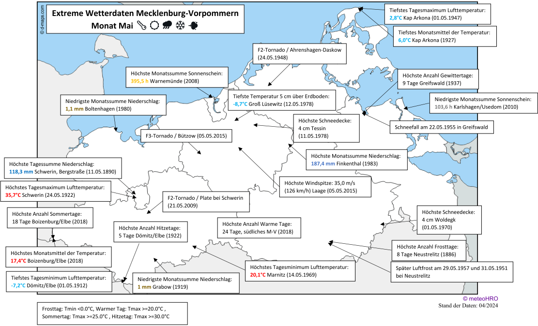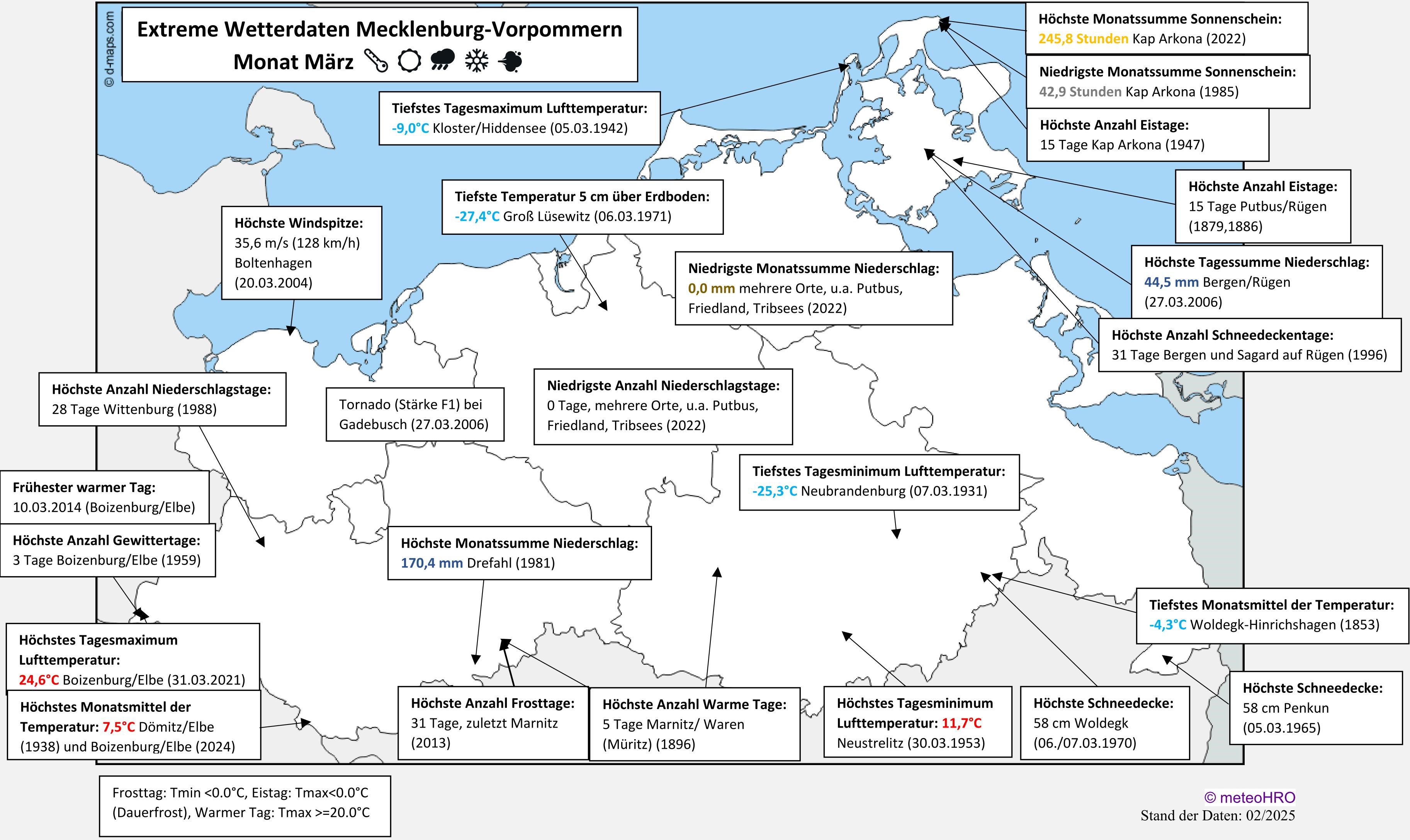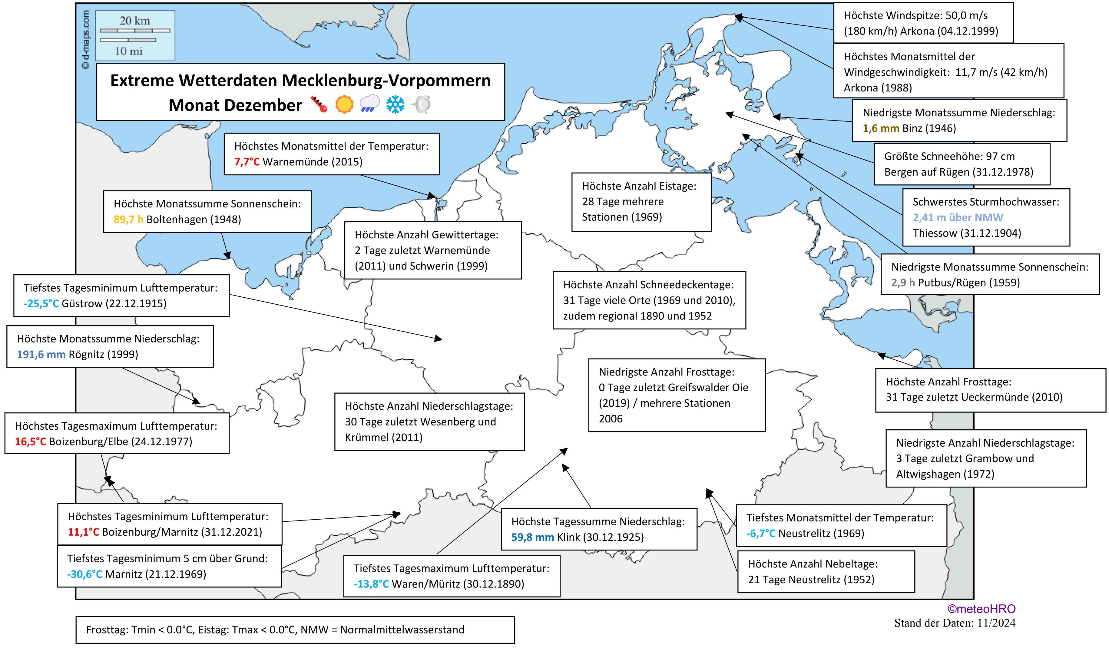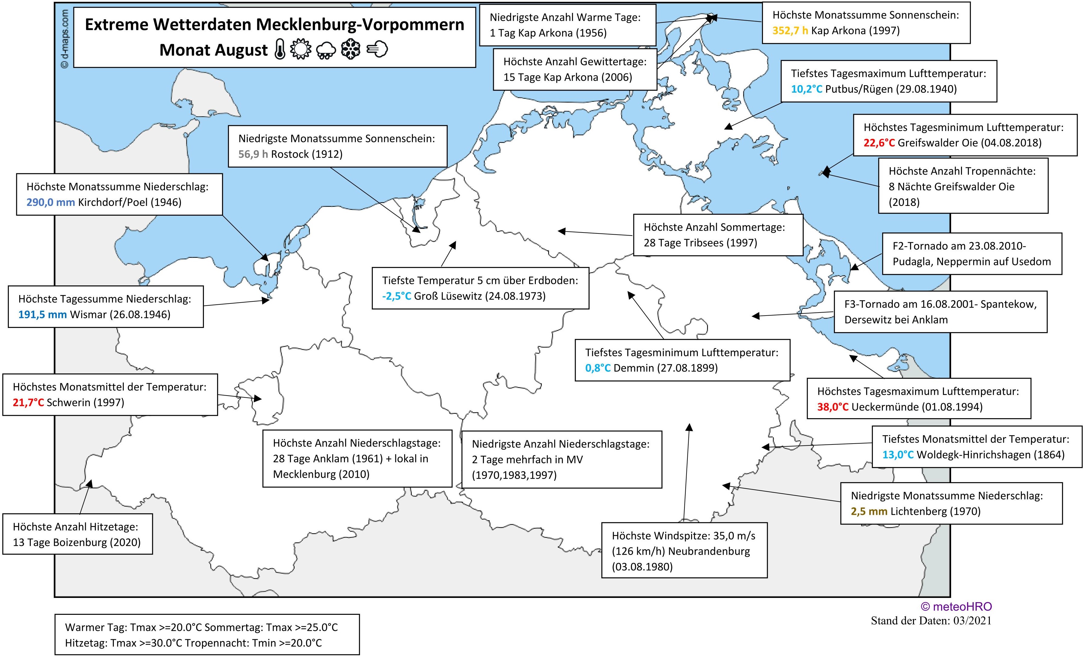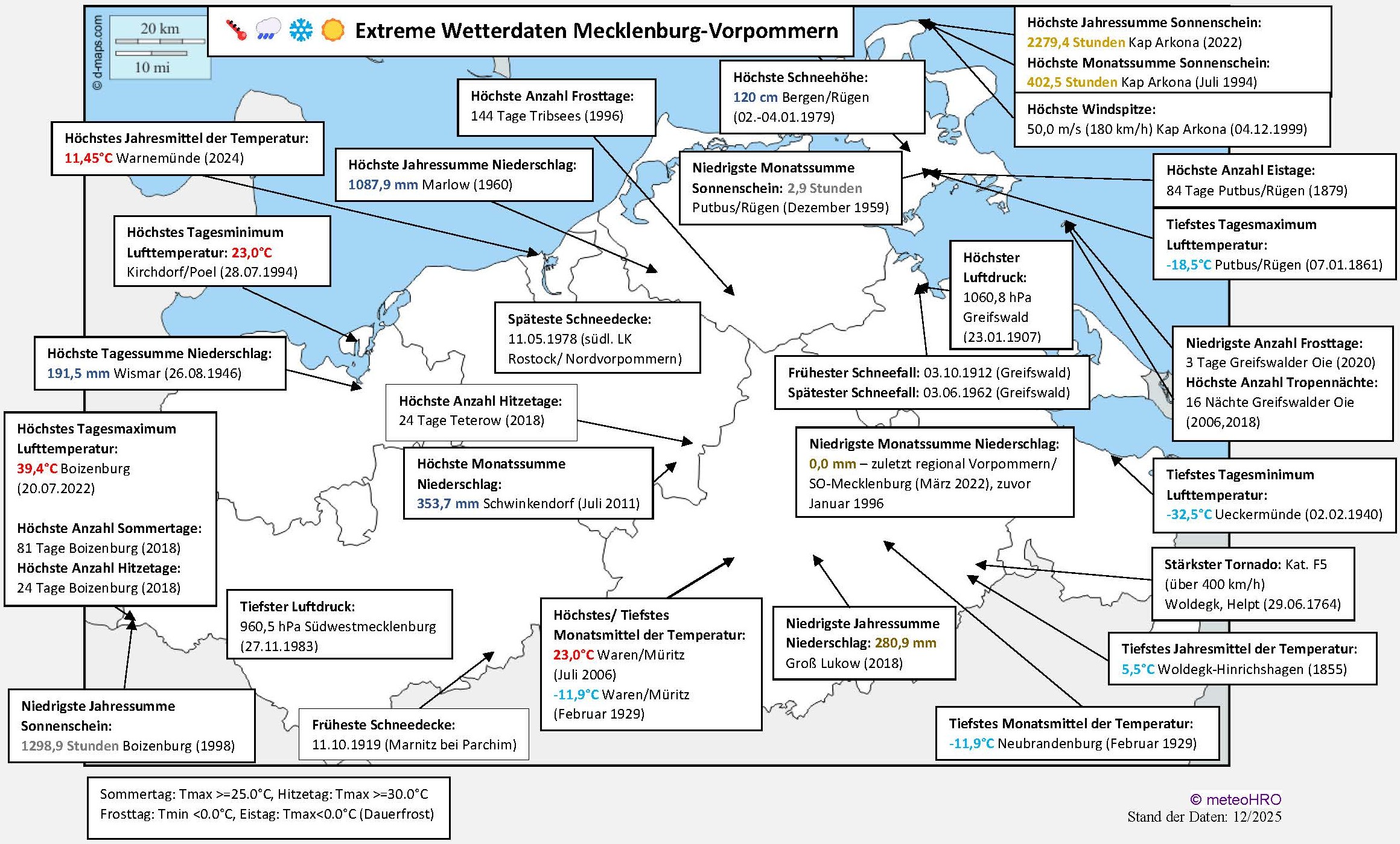 Für die Erstellung dieser Extremwertkarten wurden sämtliche Datenreihen aller Stationen des Deutschen Wetterdienstes und seiner Vorgängerorganisationen (Meteorologischer Dienst der DDR, Reichsamt für Wetterdienst usw.) für das Gebiet des heutigen Mecklenburg-Vorpommern ausgewertet und alle Rekordwerte auf Plausibilität geprüft.