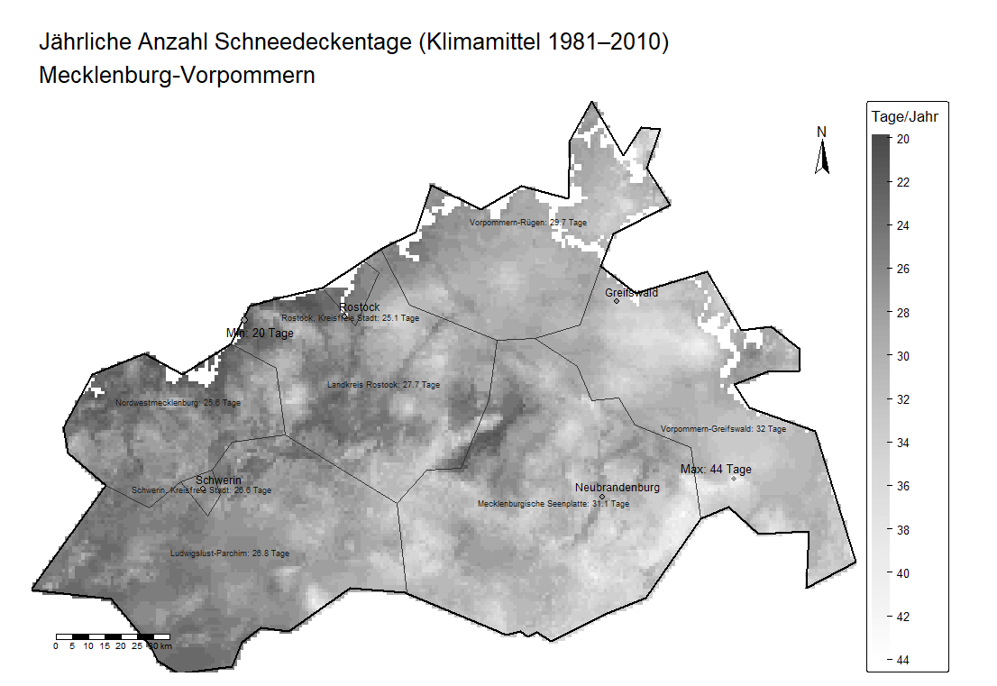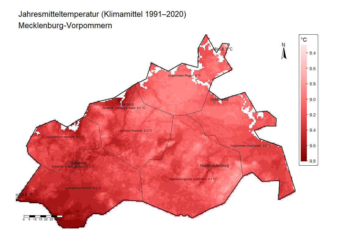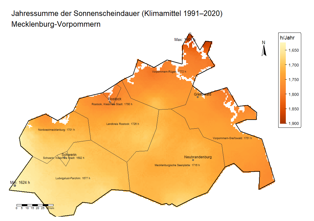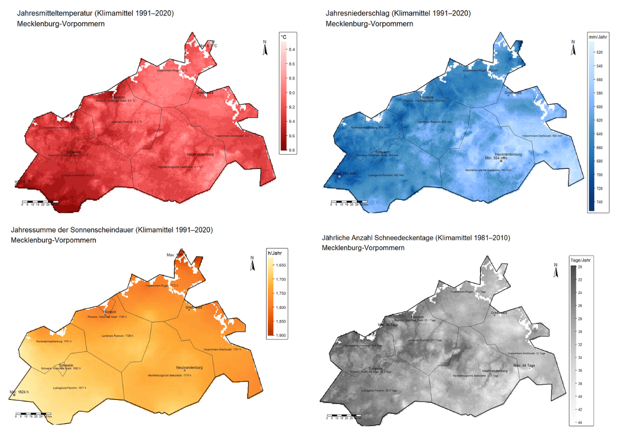 MV-Karten der Rasterdaten (1×1 km) für Temperatur, Niederschlag, Sonnenschein und Schneedecke – Klimareferenzperiode 1991-2020. Auf einen Blick erkennen, wo es im Jahresmittel am wärmsten, trockensten und sonnigsten ist sowie in welcher Region statistisch am häufigsten Schnee liegt.