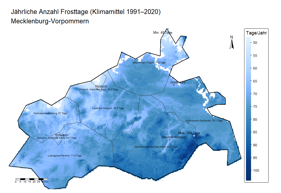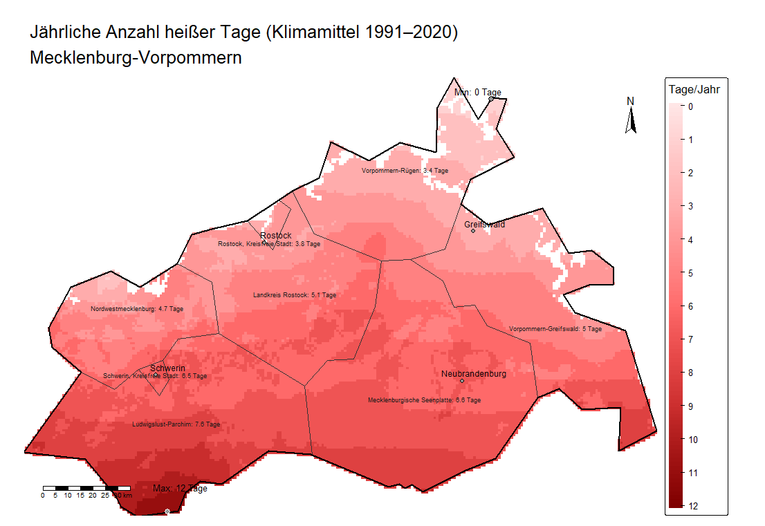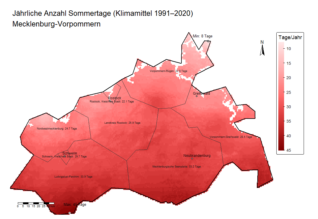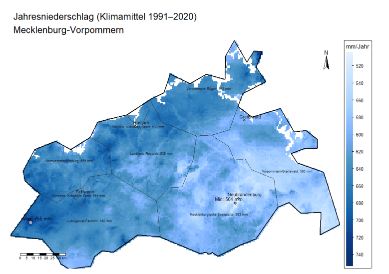MV-Karten der Rasterdaten (1×1 km) für Temperatur, Niederschlag, Sonnenschein und Schneedecke – Klimareferenzperiode 1991-2020. Auf einen Blick erkennen, wo es im Jahresmittel am wärmsten, trockensten und sonnigsten ist sowie in welcher Region statistisch am häufigsten Schnee liegt.